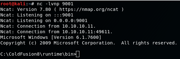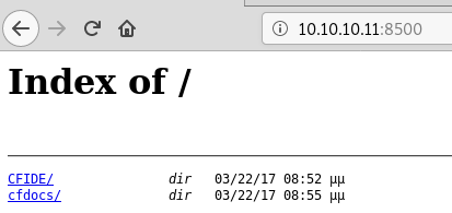 Browse to 10.10.10.11:8500/CFIDE/shell.jsp ... and we get a shell!
