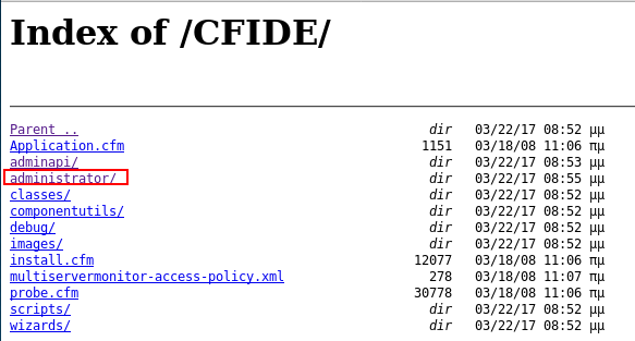 The CFIDE contents shows a directory called Administrator that gives us the administrator login page. This also confirms the ColdFusion instance running is version 8.