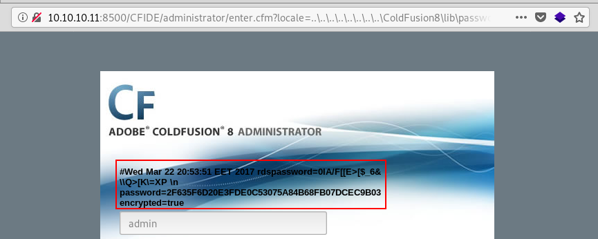 It seems that the version of ColdFusion running on the box is vulnerable to a directory traversal exploit that allows us to see the administrator password hash as it is stored locally in a file called 'password.properties'.
