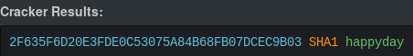 Now that we have the admin hash, which is encrypted using SHA1, we can use hashkiller to see if it can gather the plaintext password from the given hash, and as it shows, the plaintext admin password is 'happyday'