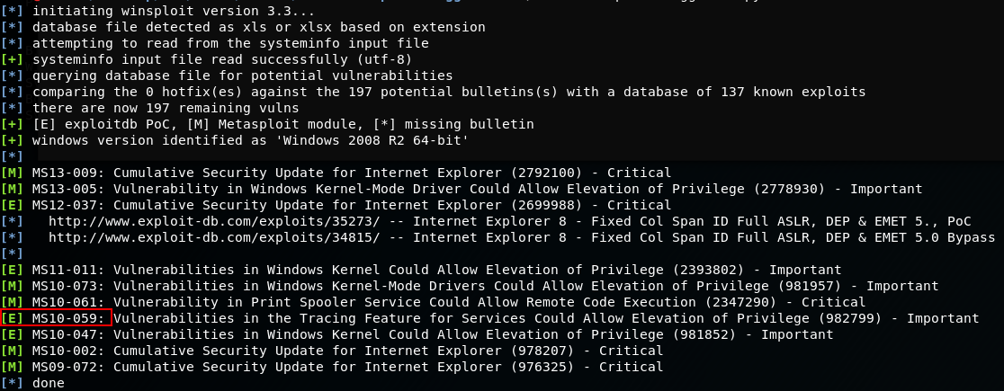 From the output we can see that there are various possible vulnerabilities but one of them interests me straight away, MS10-059.