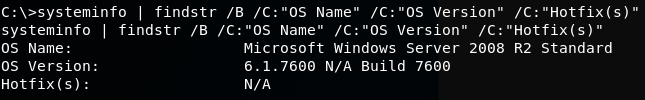 systeminfo | findstr /B /C:"OS Name" /C:"OS Version" /C:"Hotfix(s)"